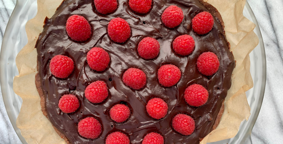 - In a bowl, combine the almond flour, cacao powder, coconut oil and date syrup until well combined. Press the mixture evenly into a parchment lined pie dish and store in the fridge.
